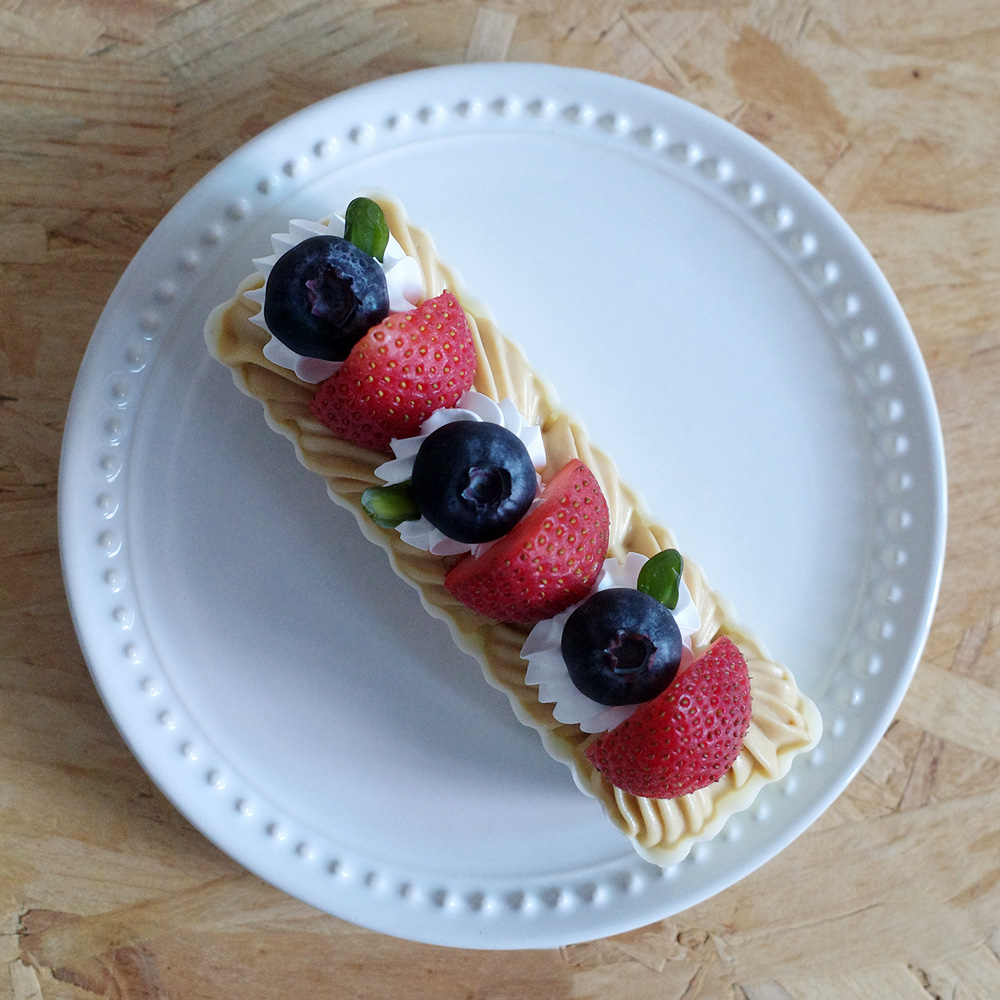 脆皮白巧克力殼 / 焦糖卡士達 / 起司餅乾、開心果裝飾 / 新鮮草莓、藍莓