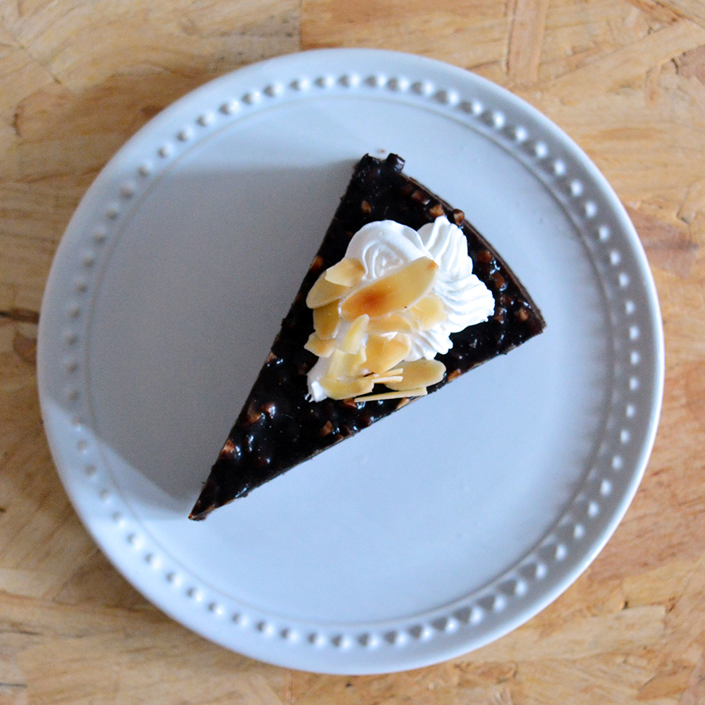 純粹而濃郁的巧克力蛋糕鋪上一層杏仁巧克力,適合搭配咖啡或茶的甜點。