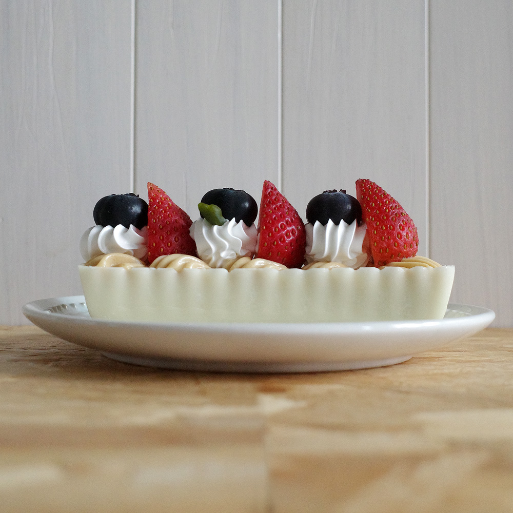 脆皮白巧克力殼 / 焦糖卡士達 / 起司餅乾、開心果裝飾 / 新鮮草莓、藍莓