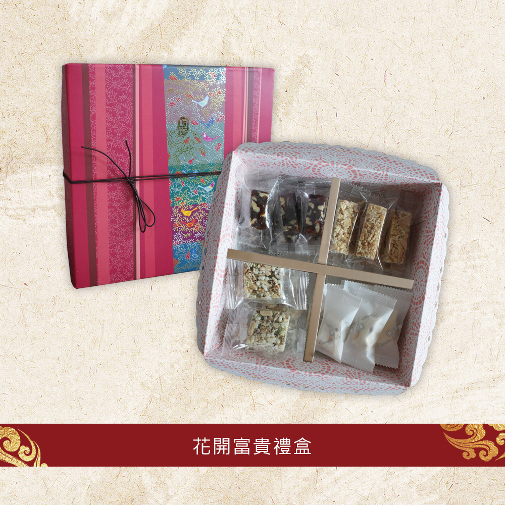 今年主打商品「杏仁果牛軋糖、南棗核桃糕、杏仁脆酥、養生堅果米酥」集結成盒,多樣口味變化,讓您新春大四喜,送禮送得有巧思。