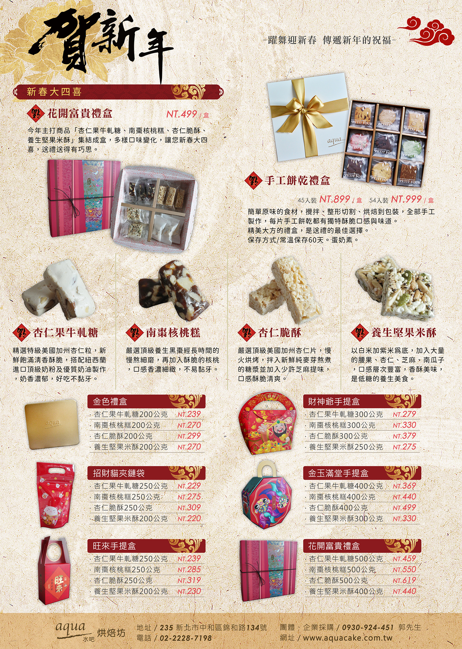 今年主打商品『杏仁果牛軋糖』、『南棗核桃糕』、『杏仁脆酥』、『養生堅果米酥』集結成盒,多樣口味變化,讓您新春大四喜,送禮送得有巧思。
